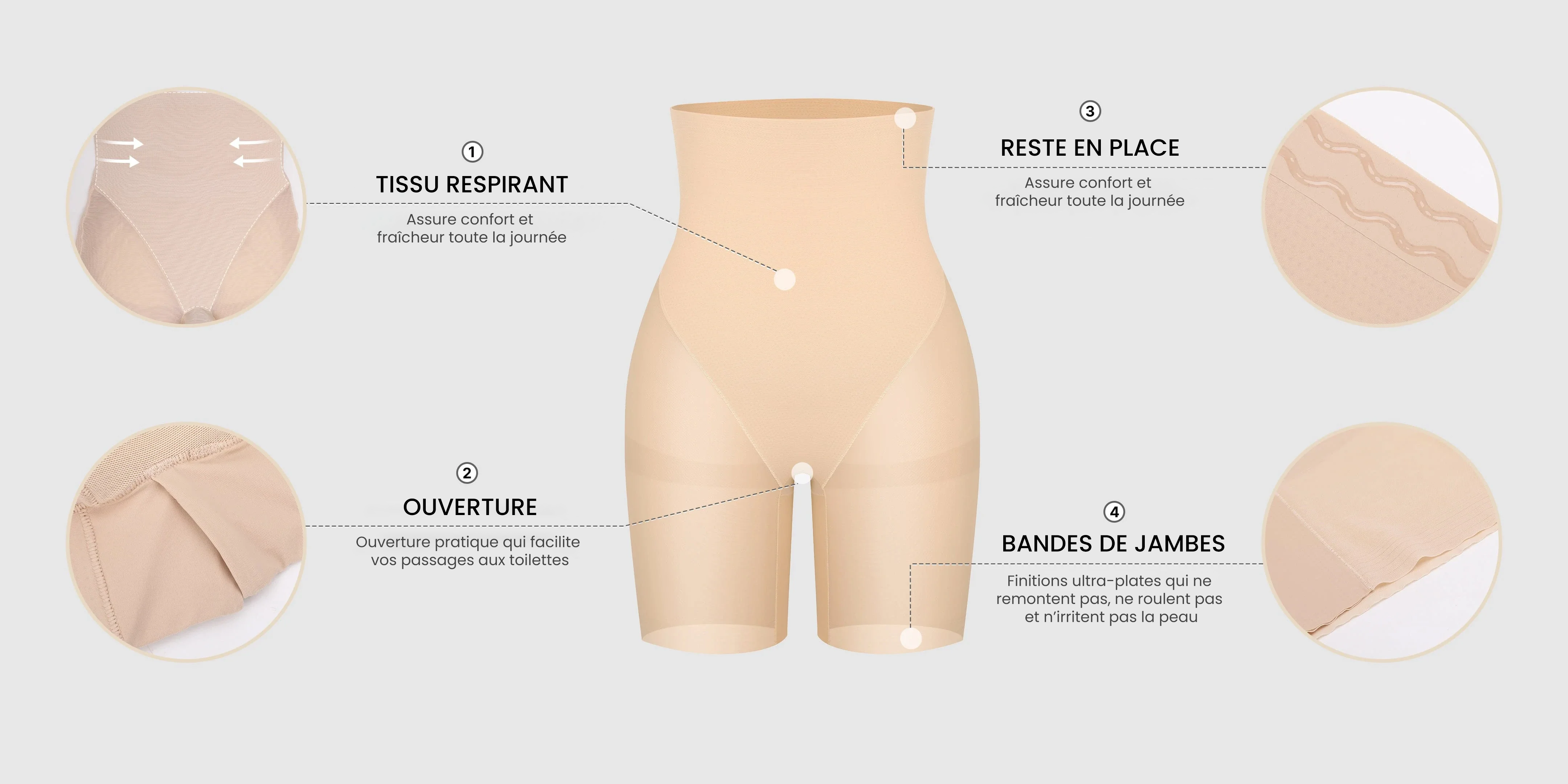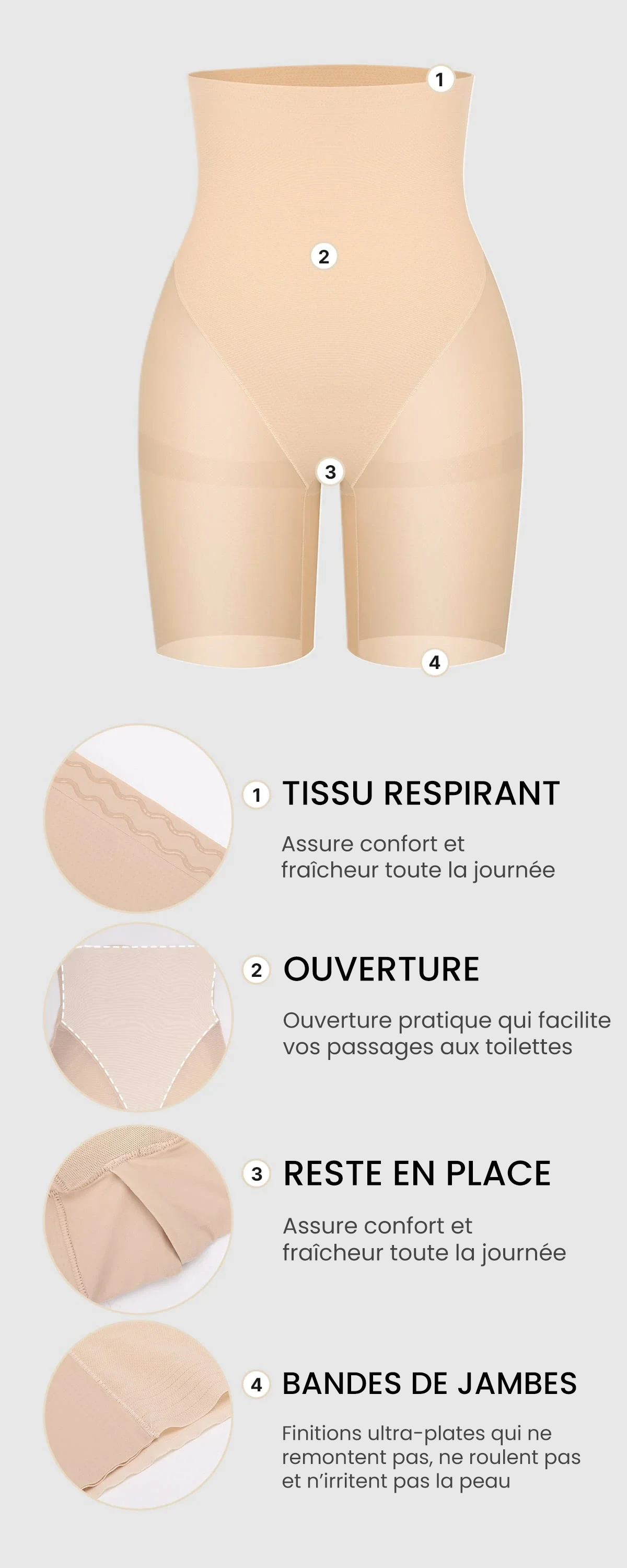 • Coupe française, bandes liftantes pour les fesses, taille haute, tissu en mesh respirant, bandes de jambes invisibles, maintien taille et cuisses, bande de taille en silicone.